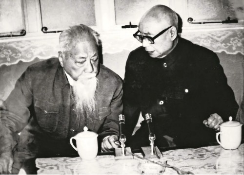 1979年11月,胡厥文带队就落实对工商业者政策问题赴上海、南京调研,之后向中共中央提出了意见和建议。图为胡厥文(左)正在听取民建上海市委会主委刘靖基(右)的汇报。