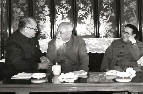 1980年4月,胡厥文(中)和王光英(左)在一起讨论原工商业者积极为四化服务的问题。